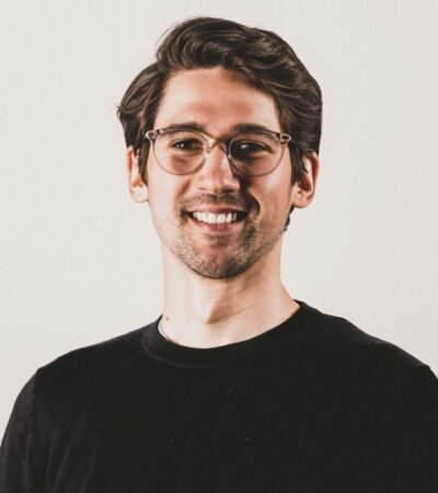 A person is standing on a ladder leaning against a building facade, appearing to perform maintenance or repairs on a window or the wall. The building has several windows and an entrance canopy. The image is in black and white, giving it a classic, timeless feel.